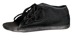 Rigid sole of corrugated thermo-plastic resin provides splinting of the foot with shock absorption. Lace up canvas upper provides greater control and better fit.